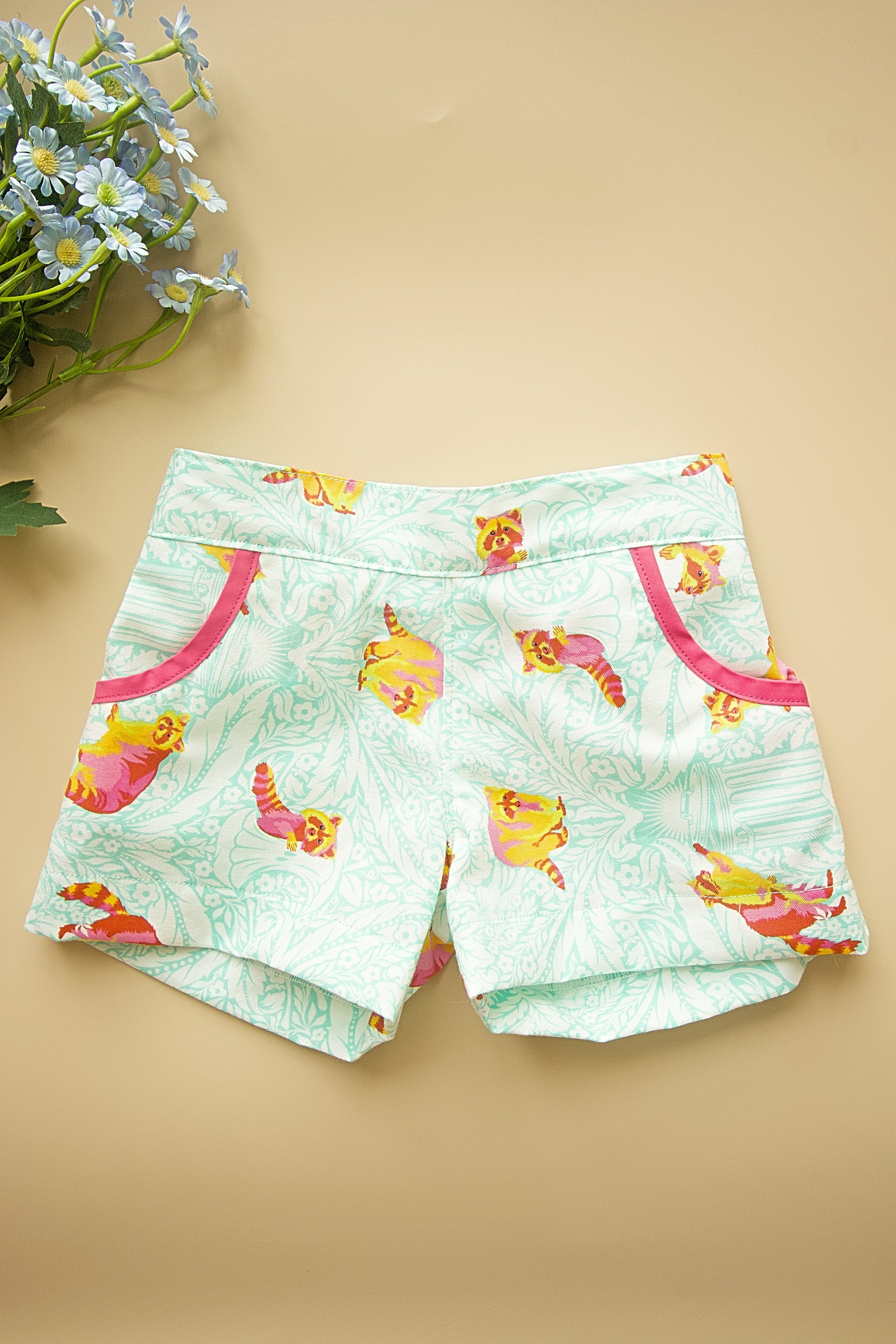 Cute pair of short-shorts, with pops of colour around the edges of the front pockets. The back of the waistband is elastic making it super comfortable. It's designed to fall above the knees and about mid-thigh.